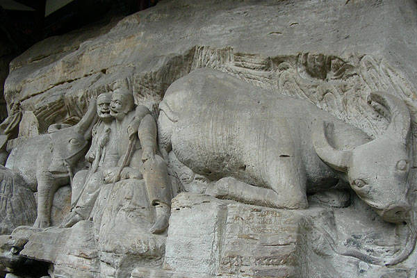 这是一组牧牛图,在宝顶山一处近30米长的崖面上。阳光照耀着山野,一个牧人牵着水牛走向田间山湾。不知怎地,水牛和牧人较起劲来。它梗着脖子,牛鼻子朝天,牛屁股蹲地,怎么也不肯跟着牧人走。牧人双腿跨地,双手死死拽着牵牛的绳子。经过几个回合的拉锯战,这头倔牛终于被驯服了。牧牛人放下了绳子,吹起了笛子。路上又巧遇了一个好友,两人勾肩搭背,聊着开心的事。水牛则歪着头,竖起了耳朵,似在偷听二人说话。一幅立体生动、沉浸式田园牧歌的画面,就这样,被刻在了崖壁之上;同时被刻下的,却是人在生活里禅悟的过程。牧人通过驯牛以调服心性,禅悟入门,达到了物我两忘的精神境界。