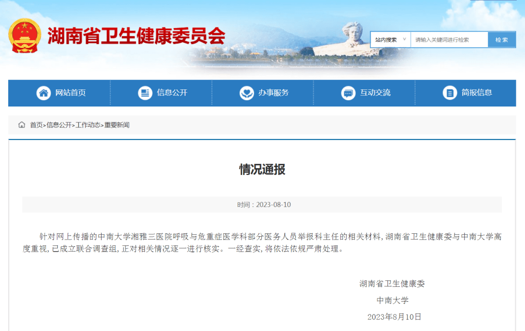 针对网上传播的中南大学湘雅三医院呼吸与危重症医学科部分医务人员举报科主任的相关材料,湖南省卫生健康委与中南大学高度重视,已成立联合调查组,正对相关情况逐一进行核实。一经查实,将依法依规严肃处理。