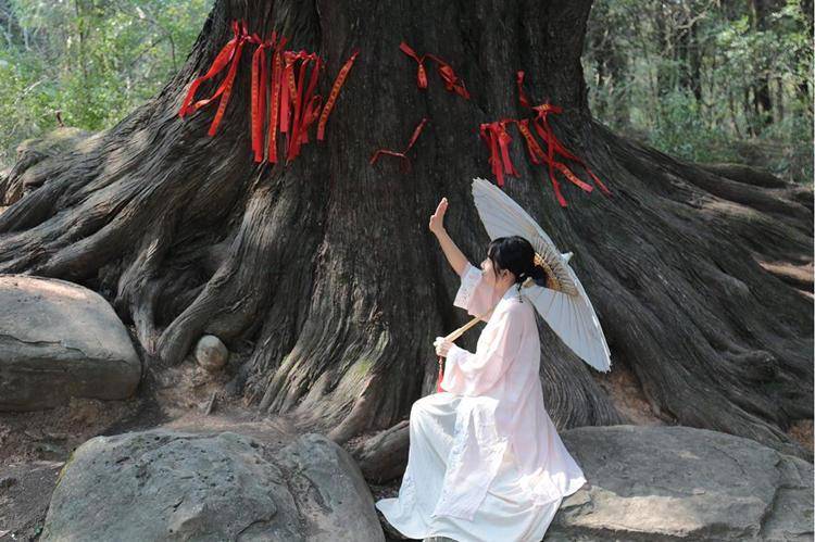 游客和古树合影。剑阁县委宣传部供图