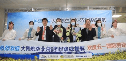 图为5月1日,中国游客乘坐时隔3年多复航的济州至北京航线抵达济州国际机场,受到济州观光公社和大韩航空相关人士等的欢迎。 图自:韩媒