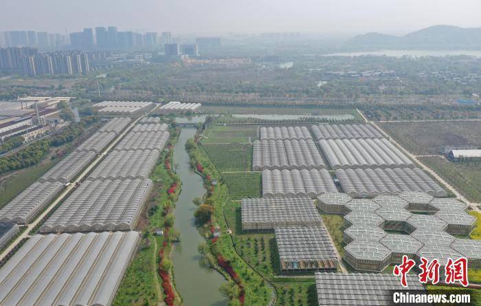 图为航拍灵粮农场的农作物大棚。 王刚 摄