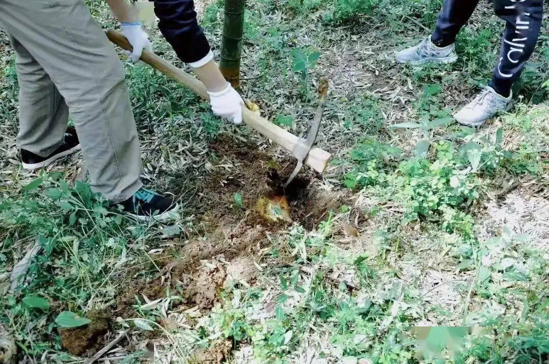 2.挖笋,要先找到刚露出“尖尖角”的春笋,然后刨开四周的泥土,一直挖到接近竹根的位置。