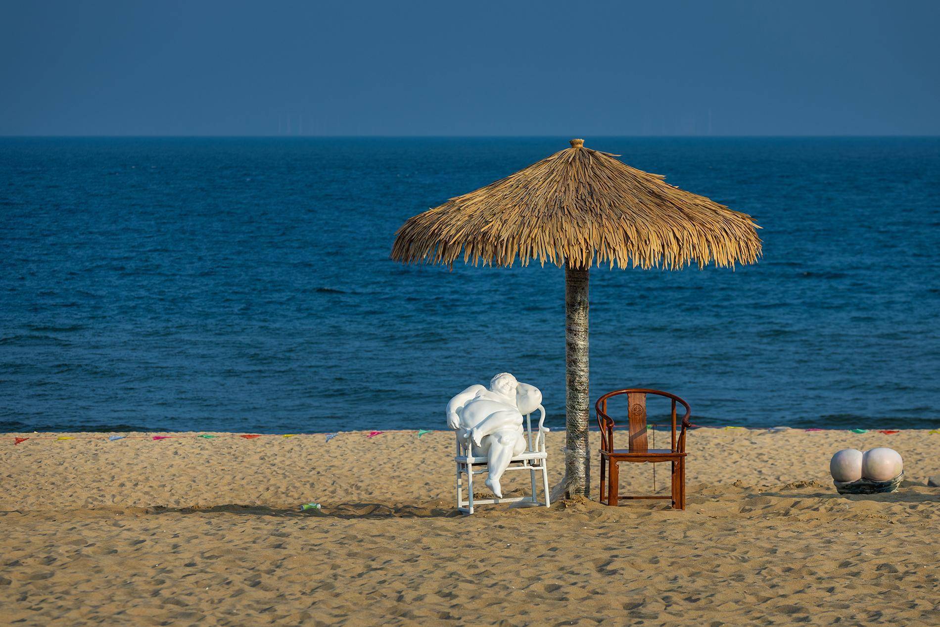 沙扒镇月亮湾的海滨沙滩展出艺术品 羊城晚报记者 邓勃 摄