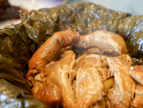 首先准备一只新鲜的鸡,然后简单处理一下,包上一张荷叶,之后裹上一层厚厚的泥土,最后放到火坑里面烤制就行。烤好之后准备一把大铁锤敲碎泥土,将里面的鸡肉拿出来就大功告成啦。这一只叫花鸡看起来的时候非常的诱人,闻起来非常的香,吃起来非常的美味。