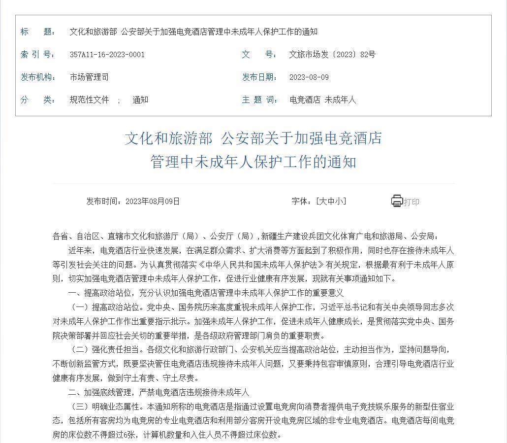 近年来,电竞酒店行业快速发展,在满足群众需求、扩大消费等方面起到了积极作用,同时也存在接待未成年人等引发社会关注的问题。为认真贯彻落实《中华人民共和国未成年人保护法》有关规定,根据最有利于未成年人原则,切实加强电竞酒店管理中未成年人保护工作,促进行业健康有序发展,现就有关事项通知如下。