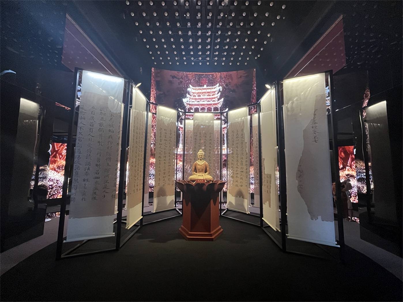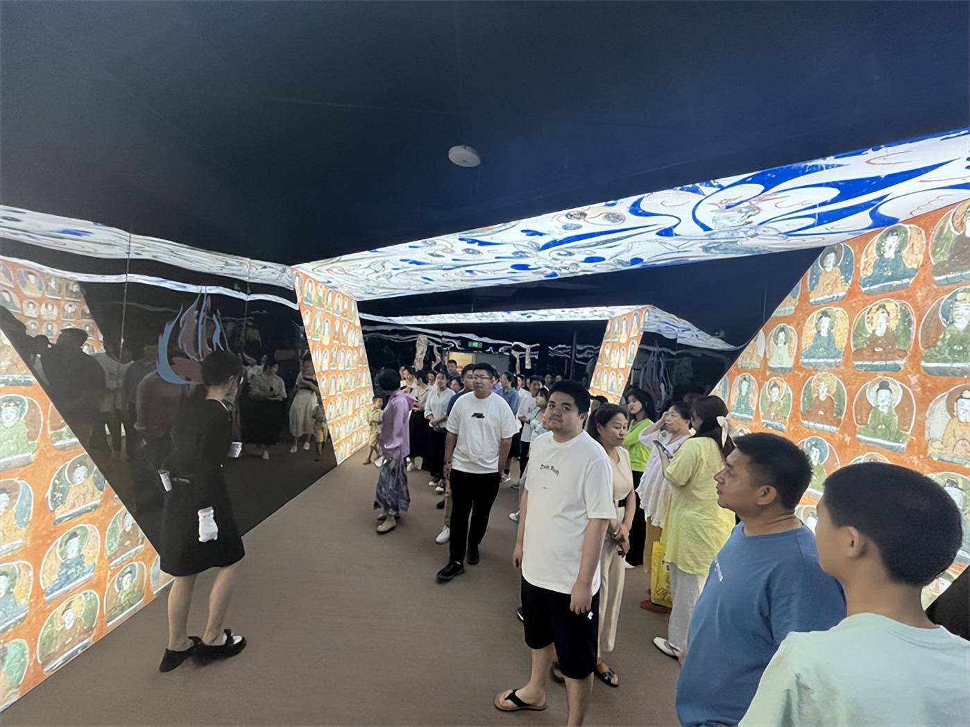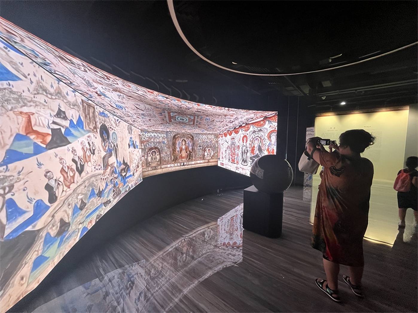展览现场,很多家长领孩子在细细欣赏领略敦煌艺术成就。现场布展细节十足,壁画、塑像、流光溢彩的音画体验,让人叹为观止。能够在家门口看到这么高级的展览,让在场参观的学生们连连赞叹。主办方还设置了盖章环节,有喜欢收集盖章的朋友可以去一试为快。