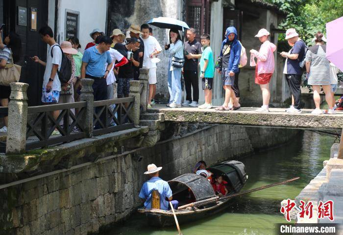 8月10日,排队的游客和划动的乌篷船形成一道靓丽风景。项菁 摄