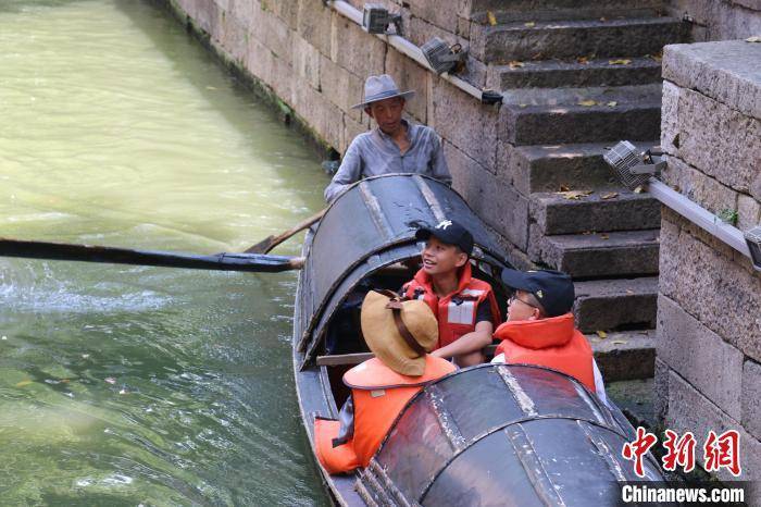 8月10日,游客乘坐乌篷船。项菁 摄