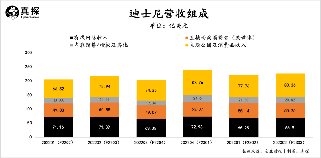 迪士尼的业务可以拆解为四部分:线性网络、直面消费者(流媒体)、内容销售/许可及其他、主题乐园体验和产品。具体来看各分部的财务详情: