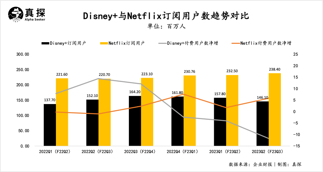 最开始,迪士尼凭借IP输血使得Disney+获得先发优势,从2019年上线用户量不断增长,用户增长数连续几个季度超越奈飞。但2023财年第一财季,Disney+用户数就开始流失,到本季度,Disney+订阅用户数流失1170万,而奈飞同期净增589万用户数。