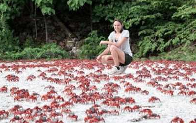 在古巴每年10月份,即热带大雨来临之时,便会聚集数以万计的螃蟹进行繁殖行动。它们经过路边、爬满沙滩,成群结队,形成了红彤彤一片,让过往的车辆为之惊叹同时又不得不练就一身好车技。一来是为了保护野生动物,二来是为了不让轮胎给刺破,纵使这样,还是死伤一片,因为数量实在是太庞大了。有这些螃蟹出没的地方一般没有车辆敢经过,因为一旦破了轮胎而不得不求助于当地居民时,一般收10美元一次的补胎,对于谁来说都是一次收费昂贵的经验,如果有机会见识这些螃蟹大军时、切匆“以车试蟹”了。