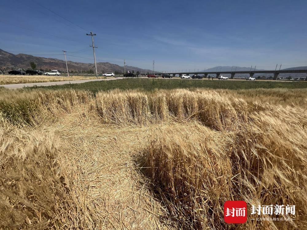 现场,有几名游客为拍到心仪的照片,进入了麦田中。“你可以沿着他们踩过的路走过来,不要踩到其他麦子。”一名正在拍照的女士招呼同伴前来拍照,而她所站的地方,就是一片倒下的麦子。