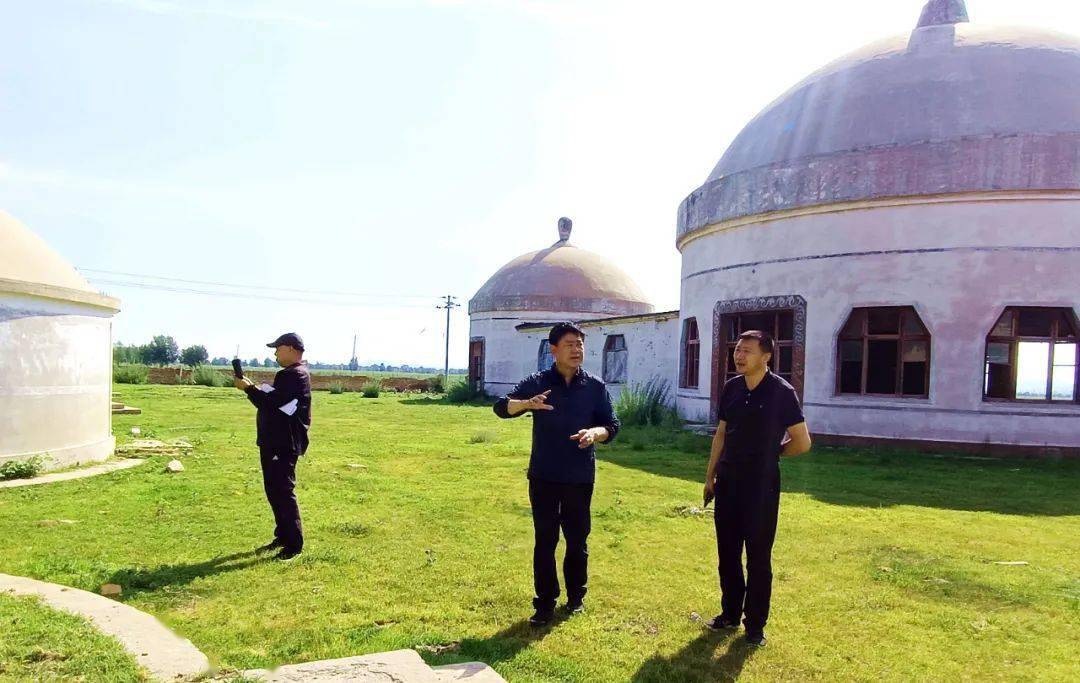 8月10日,赤峰市文化和旅游局党组书记、局长黄河,巴林右旗常驻京、津、冀、辽招商工作队长王建洲一行深入巴彦塔拉苏木草原站旧址、塔班板嘎查古榆树林实地考察调研,巴彦塔拉苏木党委书记徐敏陪同。