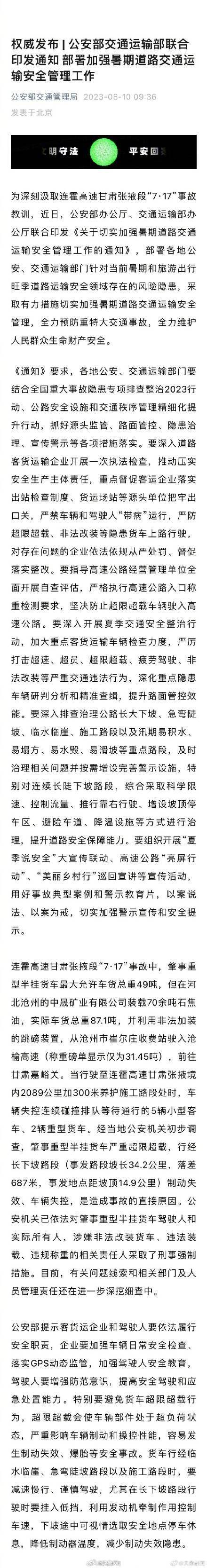 8月10日,据公安部交通管理局通报:经当地公安机关初步调查,肇事重型半挂货车严重超限超载,行经长下坡路段(事发路段坡长34.2公里,落差687米,事发地点距坡顶14.9公里)制动失效、车辆失控,是造成事故的直接原因。