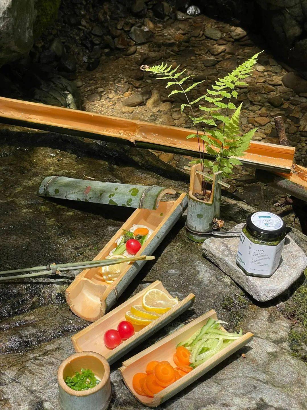 除了常规的“冰镇”食材,动手能力一流的户外达人总能迸发出各种有趣的新玩法。在溪谷搭个竹台就能体验《哆啦A梦》同款的流水素面,精致的摆盘为三伏天自动纳凉,应景程度堪称满分级别!