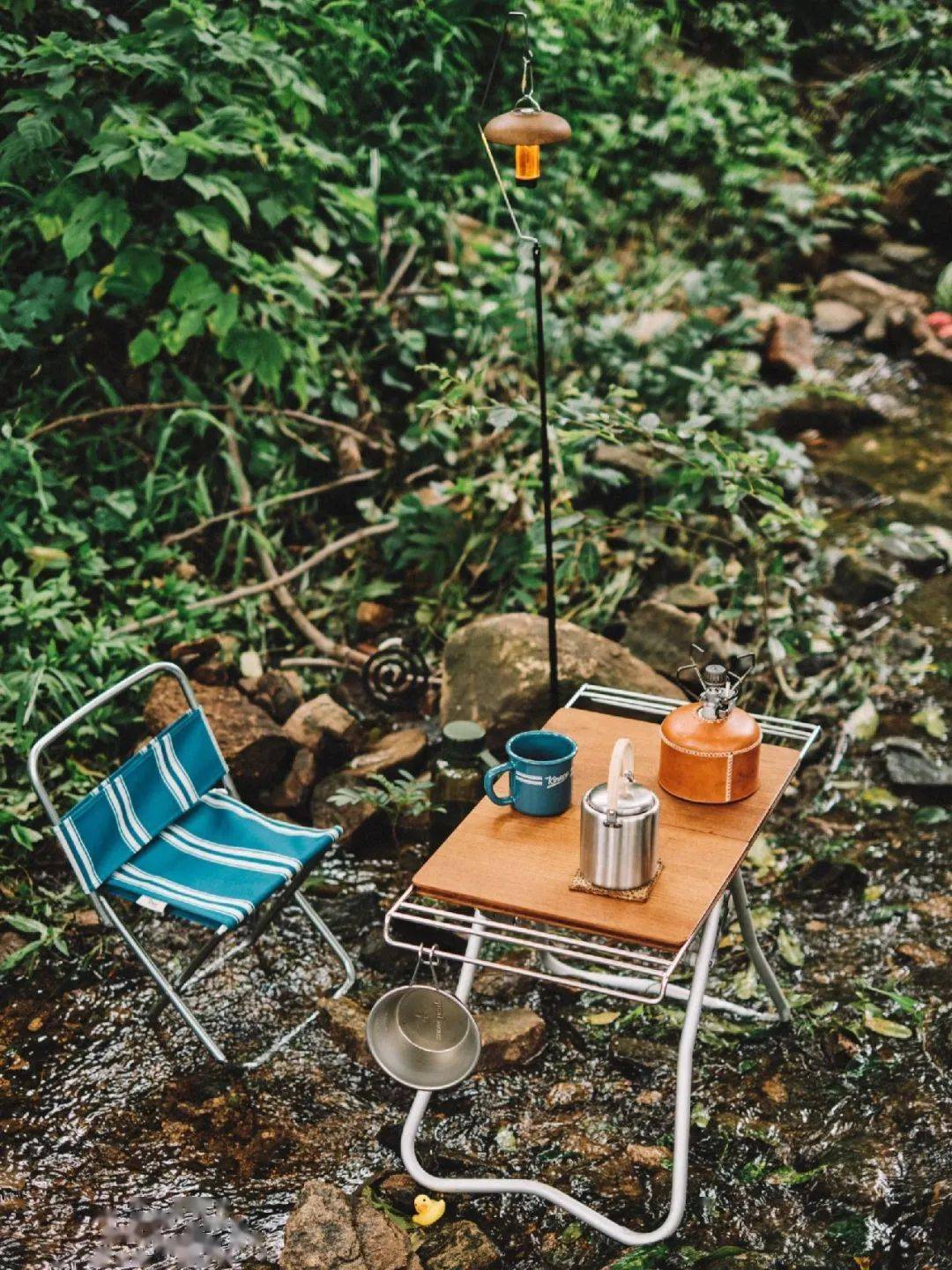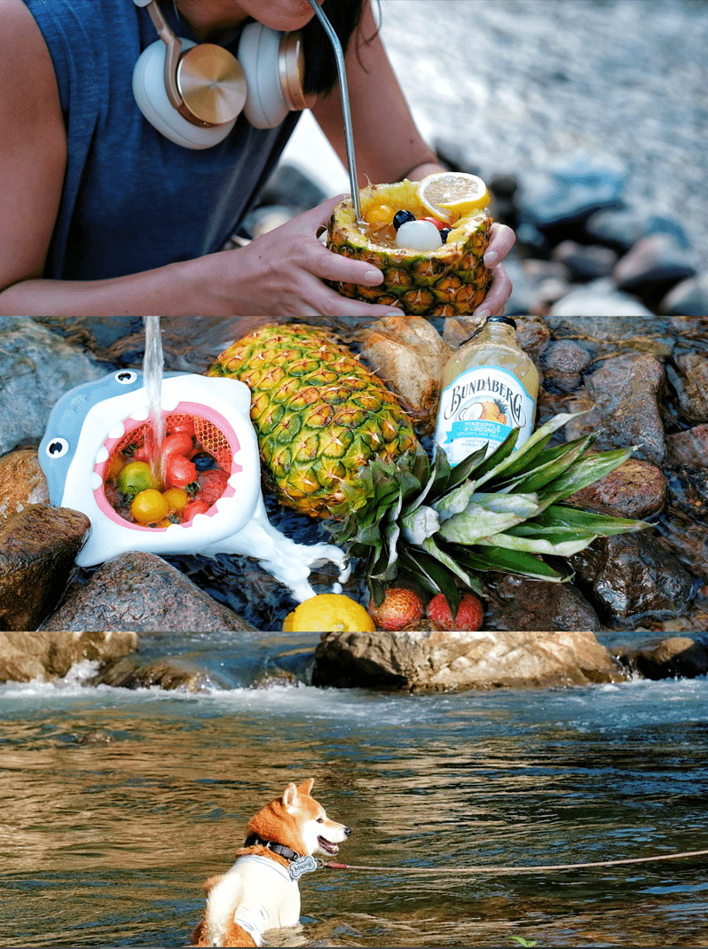 轻量的冰镇式露营还能一键切换成夏威夷度假的平替模式,自制diy菠萝特饮、色彩明艳的夏季水果、潮酷感拉满的餐具装备…拥有了这些,再择一处景色唯美的溪水旁,海岛度假的浪漫仪式感这不全都安排上了?!