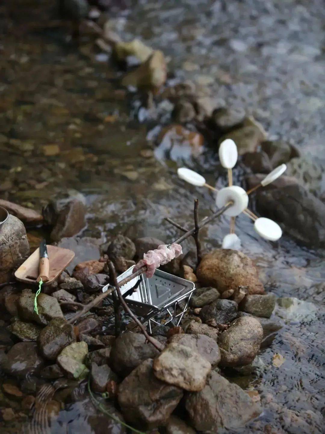 资深的户外迷们还利用地理优势玩起了新能源露营,用萝卜制成简单的水车,巧用水力与自然来了场互动合作。兼具趣味与创意的“流水线”烧烤,是不是也打开了你的露营灵感开关?