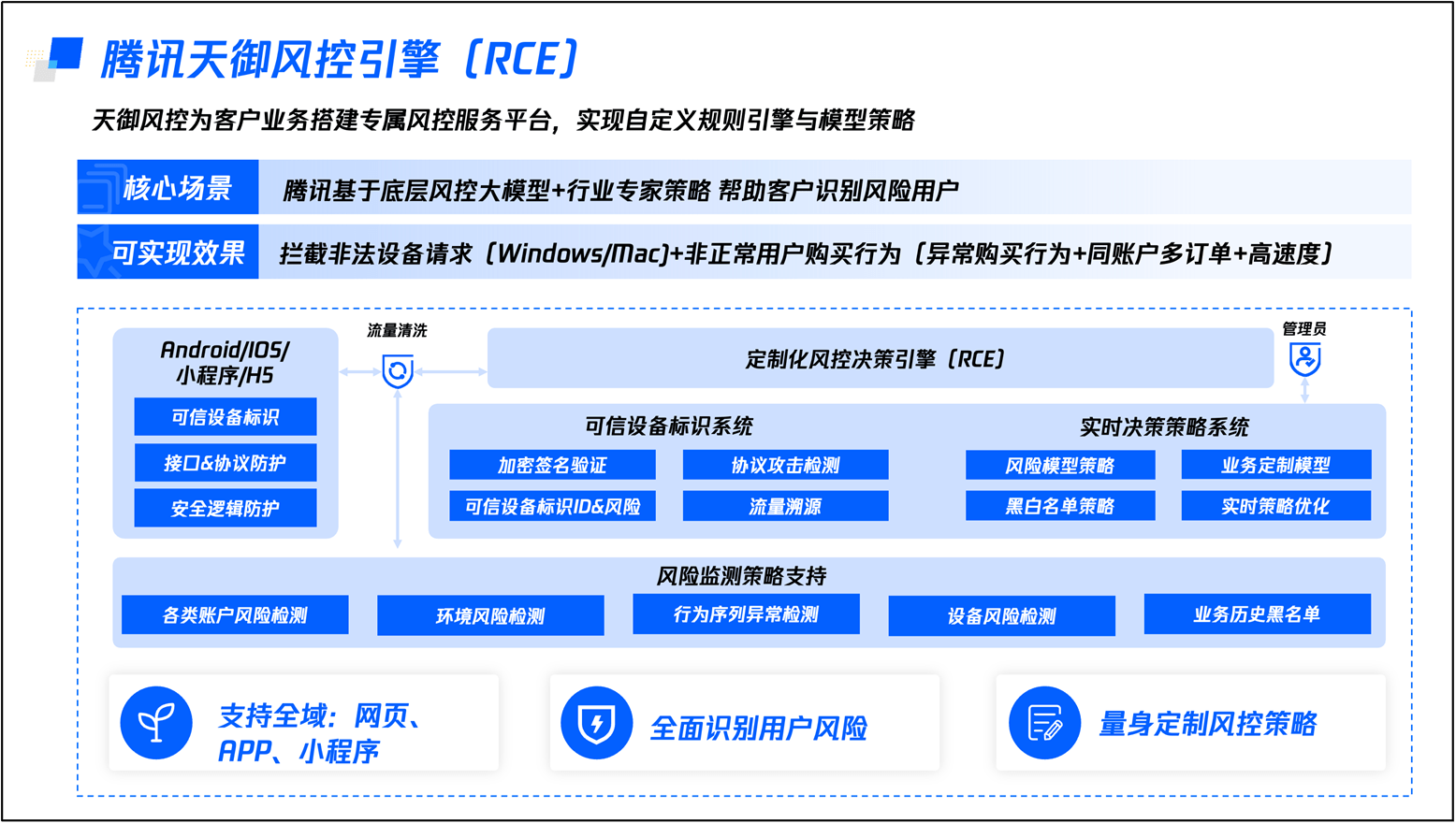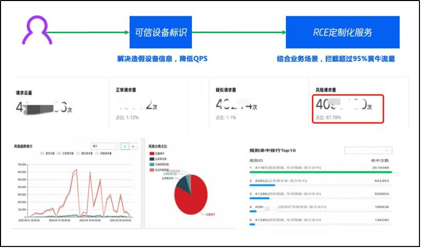 第一层防护是腾讯Web应用防火墙(WAF),通过加强前端对抗、CC防护、智能分析、BOT自定义设置等识别黄牛攻击行为,实现机器流量的拦截。第二层防护是应对传统机刷的验证码,通过图灵测试的原理进行人机校验,拦截机刷流量。第三层防护是建立可信设备标识,通过智能分析和AI算法为每一台抢票设备生成唯一的可信设备标识,从环境端识别风险因子,拦截异常的黄牛请求。第四层防护是腾讯风控大模型+定制化风控决策引擎,可以为景区快速构建专属风控服务平台,实现自定义规则引擎与模型策略。
