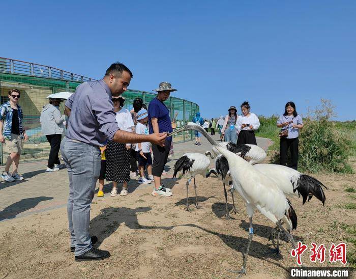 中外游客与丹顶鹤互动。沙见龙摄