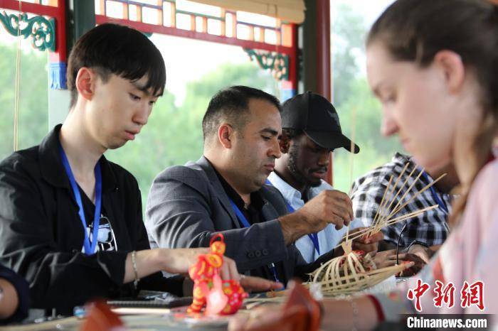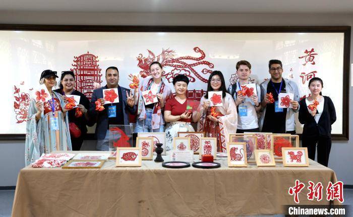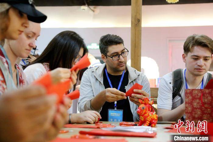 国际学生在山东省滨州市的黄河楼展厅内体验剪纸项目。沙见龙摄