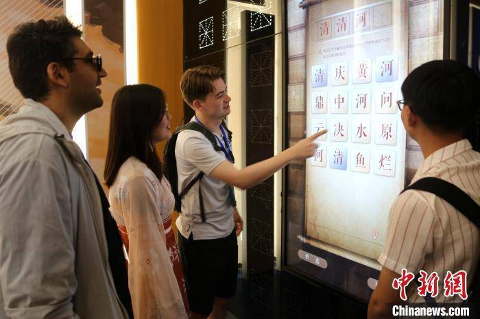 8月8日,来自山东中医药大学的多名国际学生在山东省滨州市的黄河楼展厅内,尝试拼组有关黄河的成语。沙见龙摄