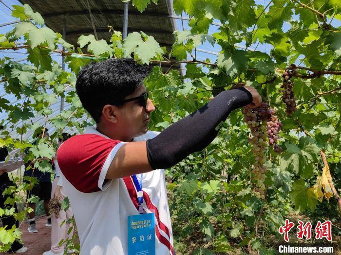 来自巴基斯坦的国际学生在东营盐碱地大棚内摘葡萄。沙见龙摄