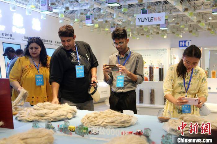 来自泰国、越南的两位国际学生触摸成品布料后,称赞布料舒适顺滑。沙见龙摄