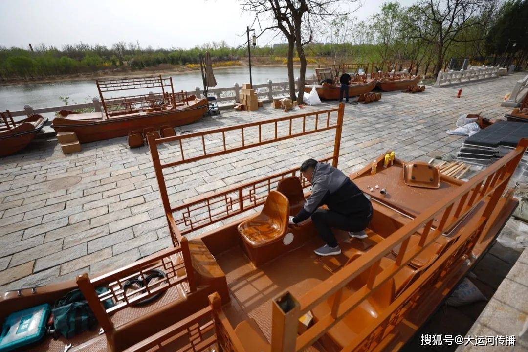工作人员在布置游船,为开园做准备。