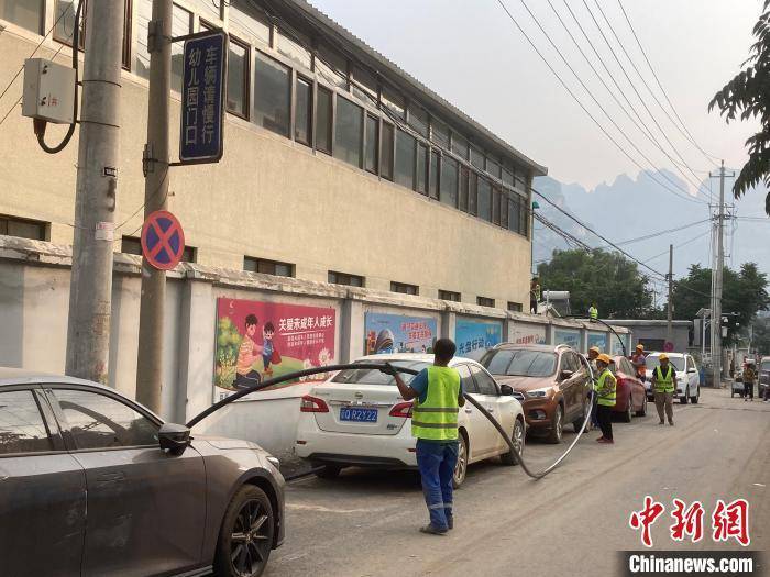 8月9日,北京市房山区十渡镇十渡村。工作人员在铺设临时水管。 中新社记者 徐婧 摄