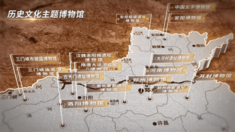 历史文化主题博物馆:河南博物院、洛阳博物馆、郑州博物馆、开封博物馆、安阳博物馆、中国文字博物馆、二里头夏都遗址博物馆、三门峡庙底沟博物馆、安阳殷墟遗址博物馆、郑州商都遗址博物院、大河村遗址博物馆、三门峡虢国博物馆、汉魏洛阳城遗址博物馆、应天门遗址博物馆、隋唐大运河文化博物馆。