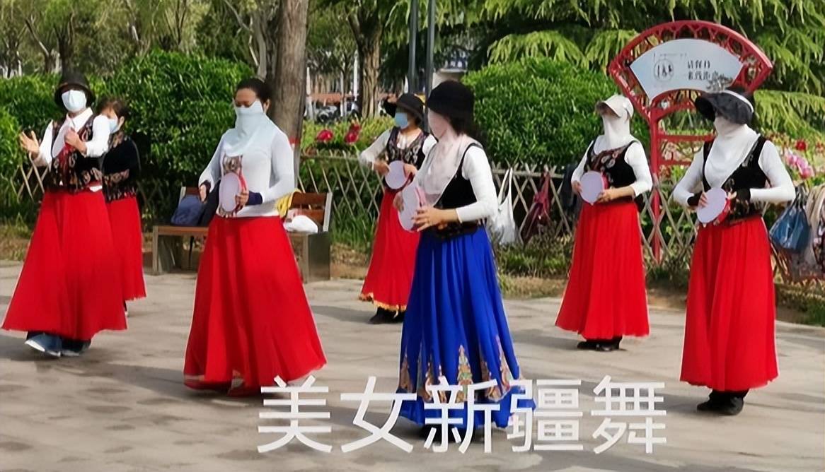 公园的入口处,一群身着民族服装的中国大妈,在欢快的音乐伴奏下,非常专业的跳着新疆舞,一招一式,秀着潇洒,亮着自信,洋溢着幸福。