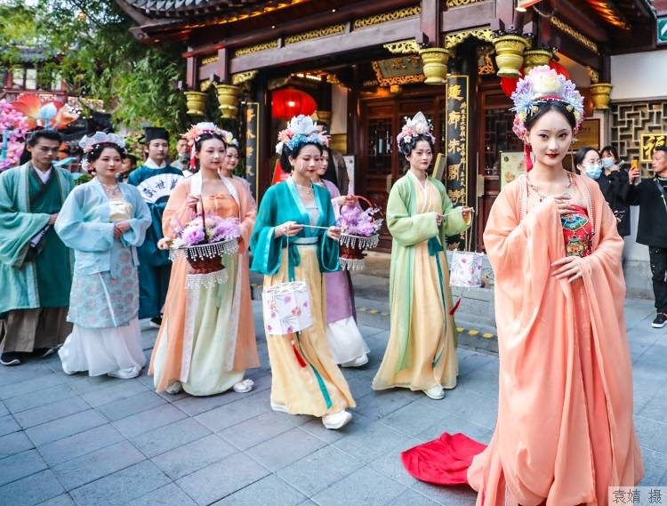 古风巡游演艺首先开启“探春”现场,九曲桥畔、湖心亭中,霓裳花神蹁跹而出,以花车为辇,缓缓而行,巡游间依序点亮六盏巨型花灯。张灯结彩的桥畔广场,文人雅士于九曲流觞台前推杯换盏、宴饮私语;衣香鬓影的黄金广场,辛勤劳作的春装妇人相约捣练制衣,技艺娴熟;校场路上人头攒动、摩肩接踵,穿汉服游园者,还可参加仪式感满满的簪花仪式,获得免费花簪一支;逛花市、吃春酒,非遗匠人亮相古风市集,文创工艺精品琳琅满目;酣畅游园意犹未尽的花神最终登临花车,一曲动人舞姿,将巡游演艺推至高潮。