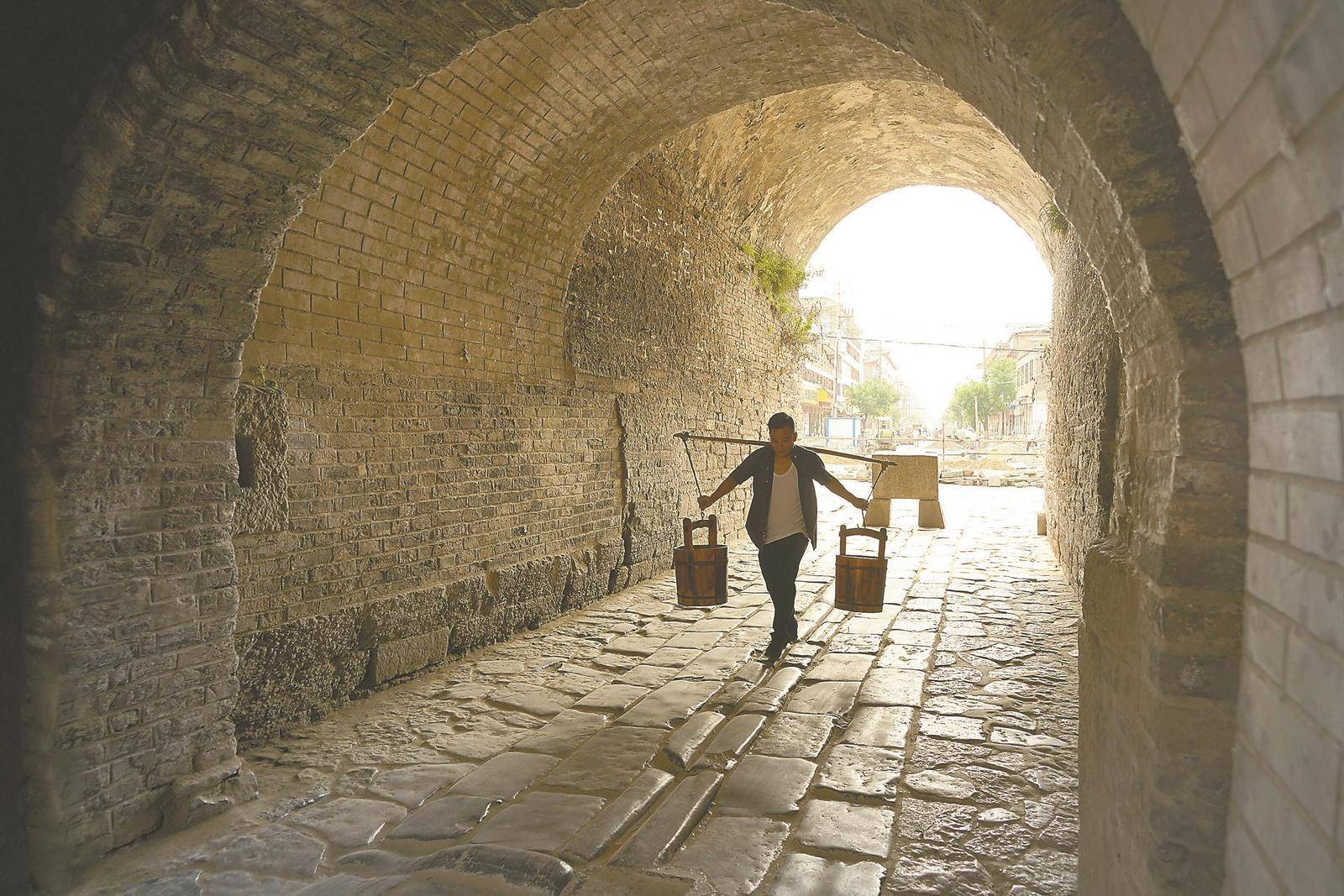每天,寿州豆腐宴制作技艺代表性传承人张士宏都要穿过古城门,挑来玛瑙泉水制作豆腐。 记者 李博 摄