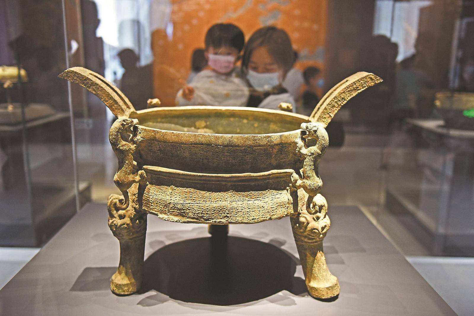 参观者在寿县安徽楚文化博物馆内欣赏青铜器铸客升鼎。 特约摄影 陈彬 摄