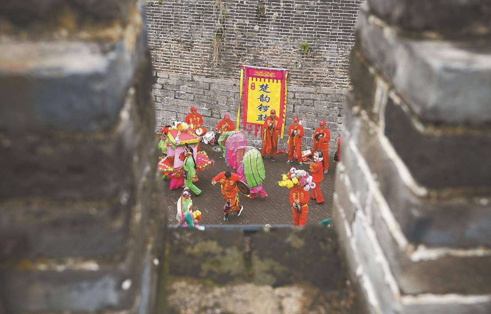 寿县非遗传人在古城表演省级非遗“寿州楚韵锣鼓”。 记者 李博 摄