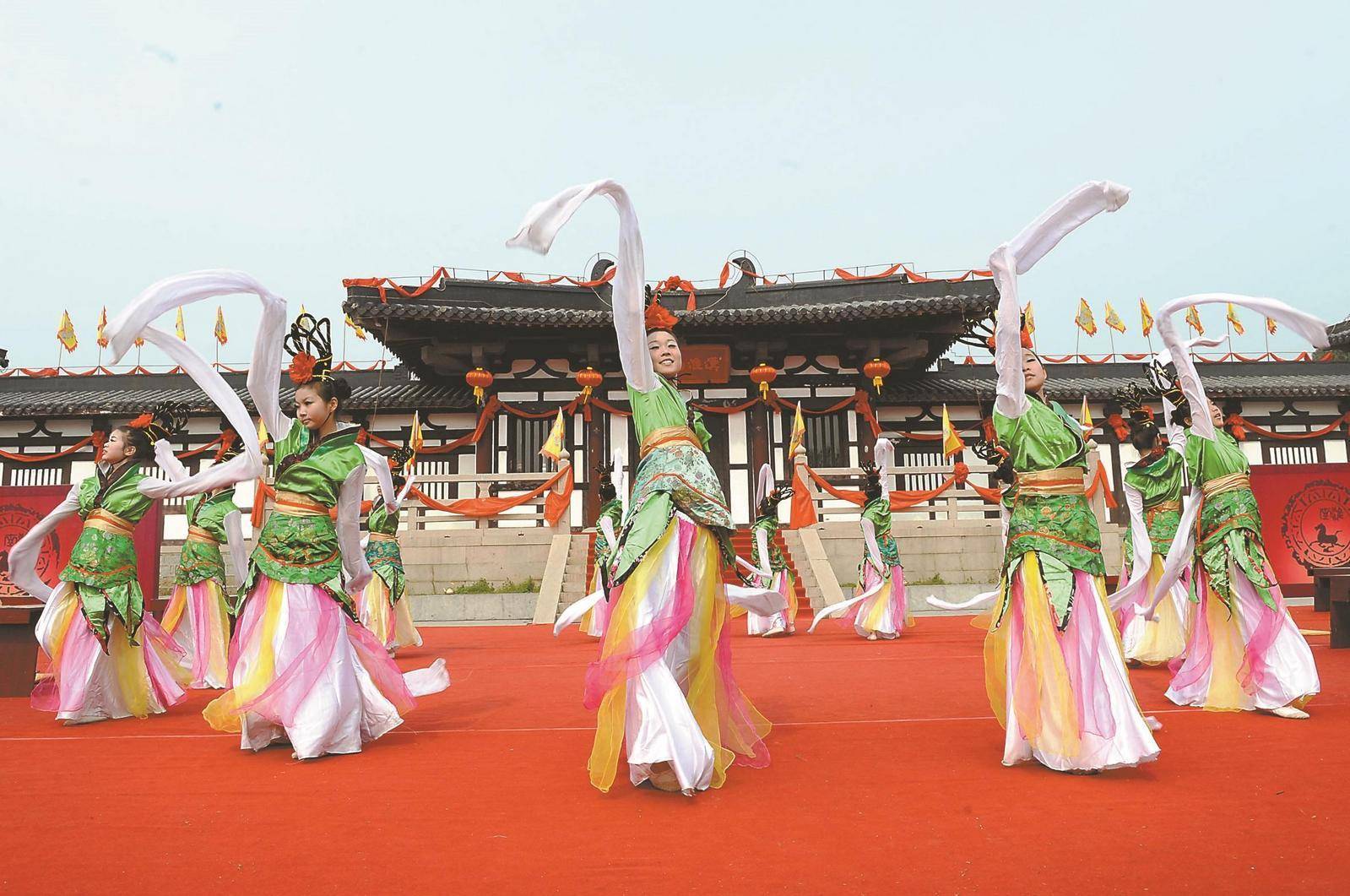 舞蹈演员在淮南八公山汉淮南王宫前展示汉代歌舞《踏歌》。淮南市将旅游资源开发与传统文化弘扬有机结合,通过在景区集中展示展演汉代鼓乐、歌舞、礼仪等,吸引游客关注传统文化。特约摄影 陈彬 摄