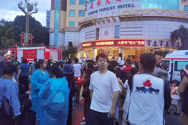当晚8点,云南省石林彝族自治县火把节在县城中心转盘举行,各族群众从四面八方向中心聚集,县交警为举行此项活动实行了对该区域交通管制。
