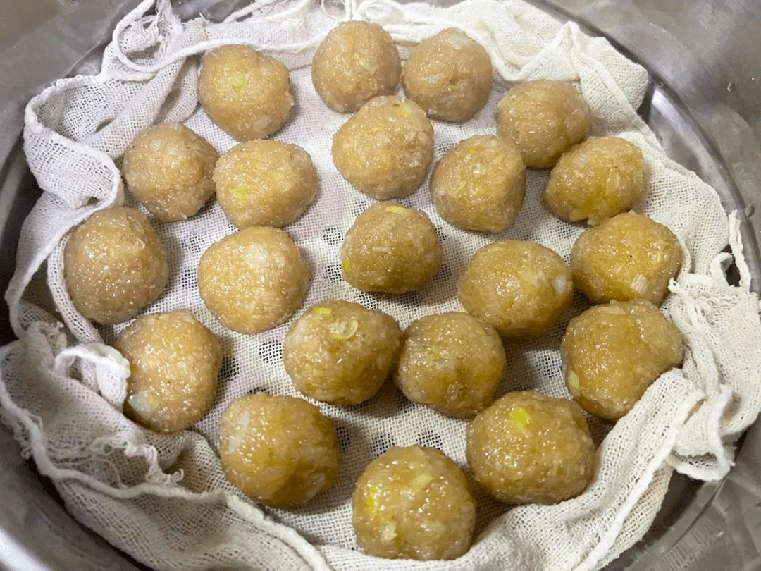 在制作“合楞子”时,需把土豆上锅蒸熟,去皮后捣成土豆泥,再把水分挤出,加入白面揉成团,再上锅猛火蒸熟就制作完成了。