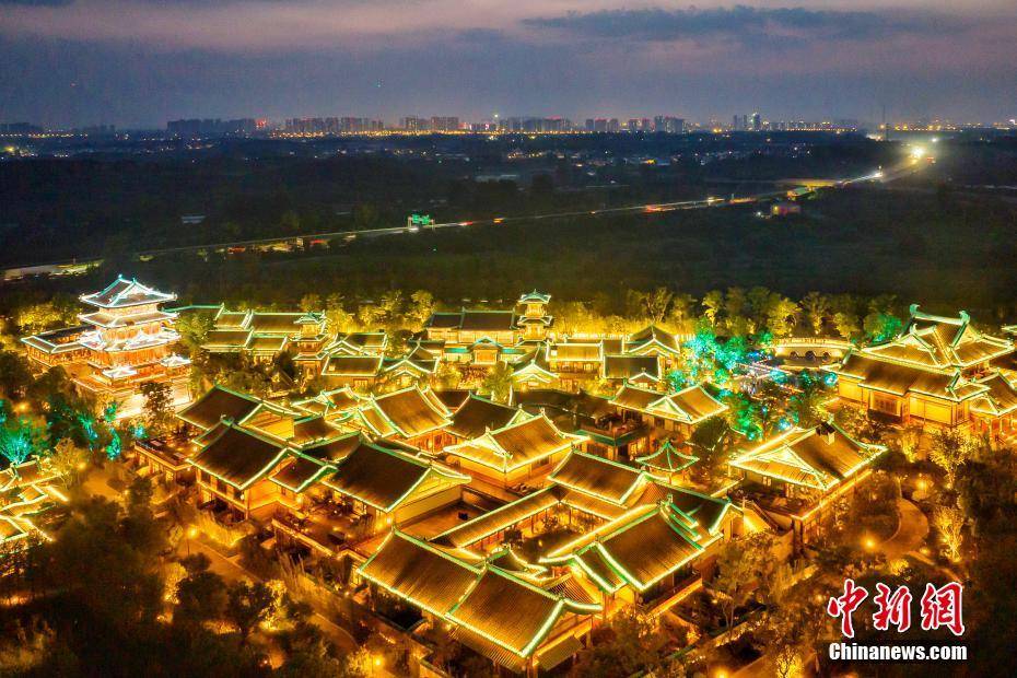 8月10日晚,江苏南京,航拍位于牛首山文化旅游区的金陵小城·燕集里,流光溢彩再现金陵(南京古称)盛景。