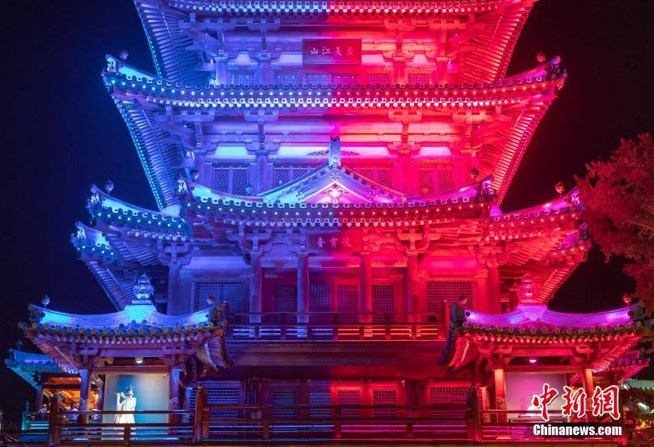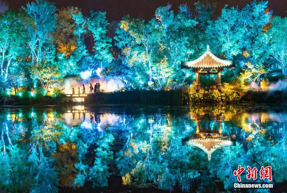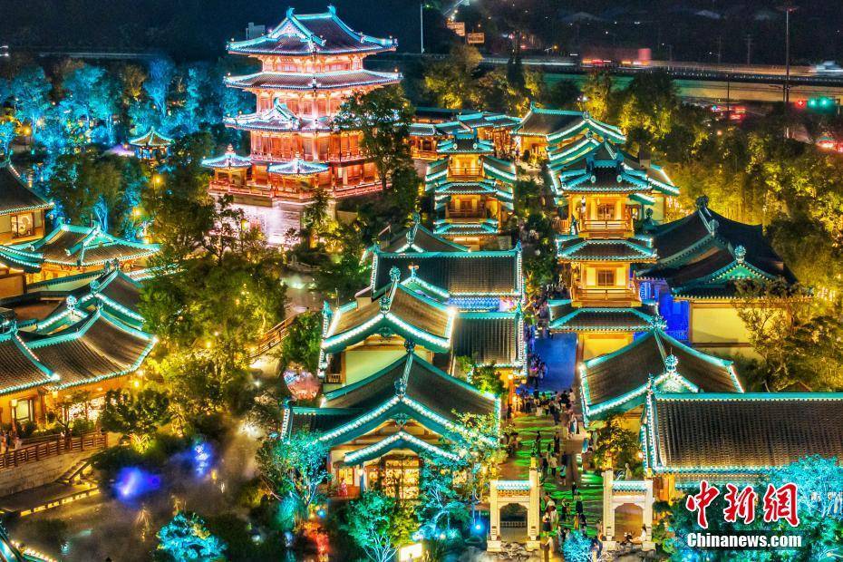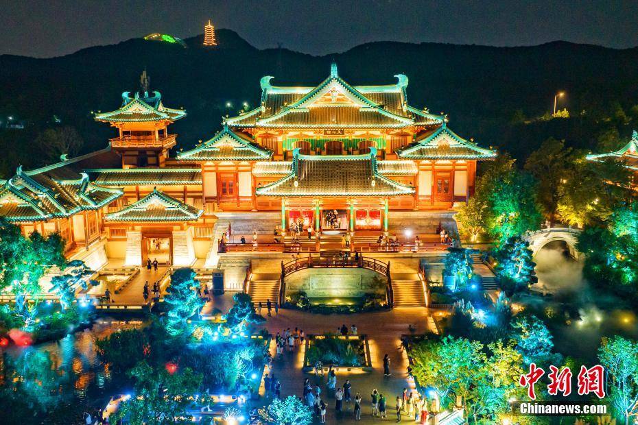 8月10日晚,江苏南京,位于牛首山文化旅游区的金陵小城·燕集里流光溢彩,移步易景的场景变化再现金陵(南京古称)盛景。