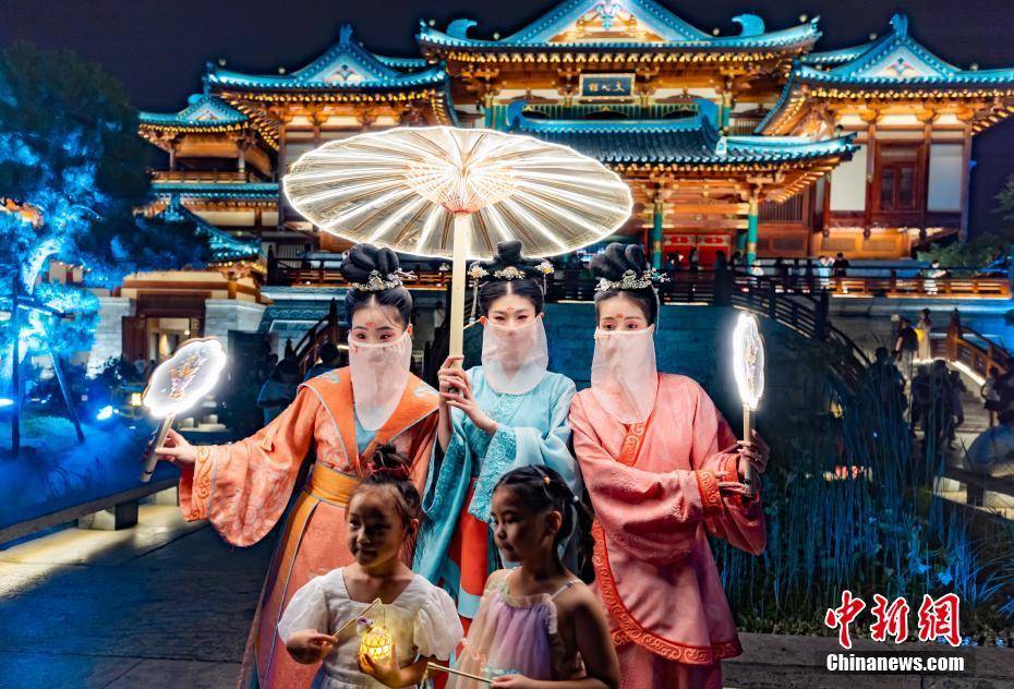 8月10日晚,江苏南京,演员身着古装在金陵小城·燕集里与孩子们合影。