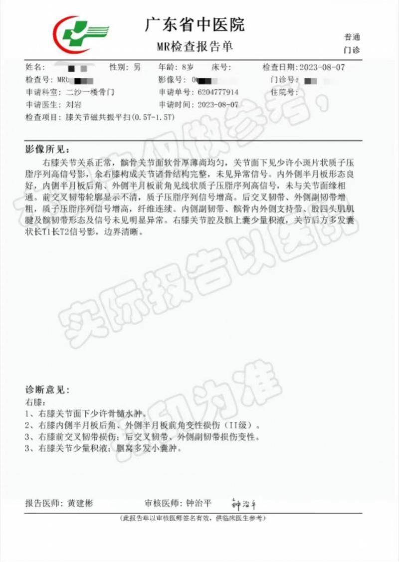 8月3日,李女士带浩浩前往中山大学附属第一医院拍X光检查,骨头未见损伤。李女士说:“可是后来小孩一直说疼,怕有隐患,我们就去做了核磁共振”。8月7日,李女士带浩浩到广东省中医院进行核磁共振检查,MR检查报告单显示,浩浩的右膝内侧半月板后角、外侧半月板前角变性损伤(Ⅱ级),右膝前交叉韧带损伤,后交叉韧带、外侧副韧带损伤变性,并存在右膝关节面少许骨髓水肿、右膝关节腔少量积液、腘窝多发小囊肿的情况。