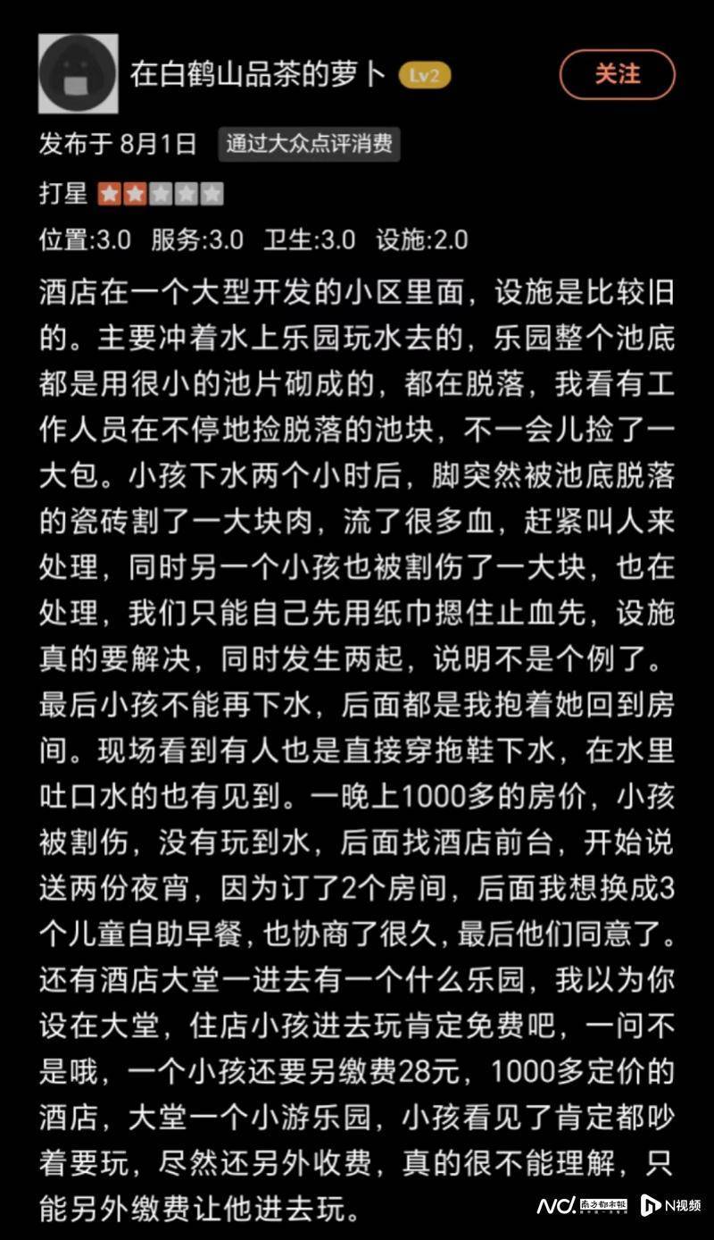 在大众点评平台上,昵称为“在白鹤山品茶的萝卜”的游客于2023年8月1日评论佛冈熹乐谷温泉度假区的水上乐园:“乐园整个池底都是用很小的池片砌成的,在脱落,我看有工作人员在不停地捡脱落的池块,不一会儿捡了一大包。小孩下水两个小时后,脚突然被池底脱落的瓷砖割了一大块肉,流了很多血,赶紧叫人来处理,同时另一个小孩也被割伤了一大块,也在处理,我们只能自己先用纸巾摁住止血先,设施真的要解决,同时发生两起,说明不是个例了。”