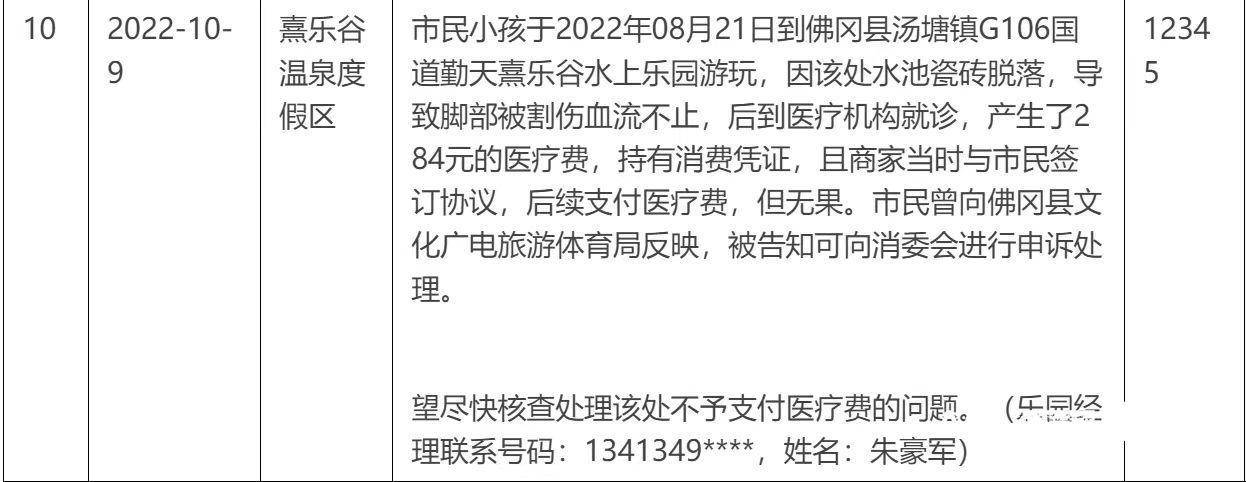 记者在佛冈县文化广电旅游体育局政府信息公开平台法定主动公开内容栏目上搜索发现,在2023年2月28日公开的2022年下半年佛冈县旅游投诉情况中,2022年10月9日已有市民投诉称该水上乐园水池瓷砖脱落,割伤小孩。