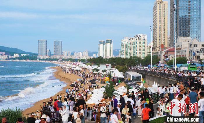 8月10日,在位于山东威海高新区的国际海水浴场、火炬八街、小石岛等海滨景区,游人如织。游客沿海岸线观光游玩,尽享清凉。海滨咖啡厅、美食街、文创店等生意火热。