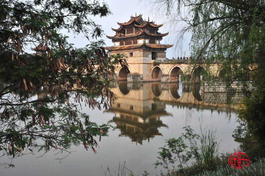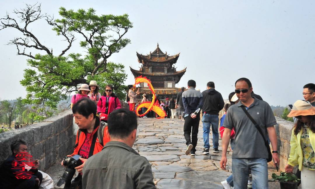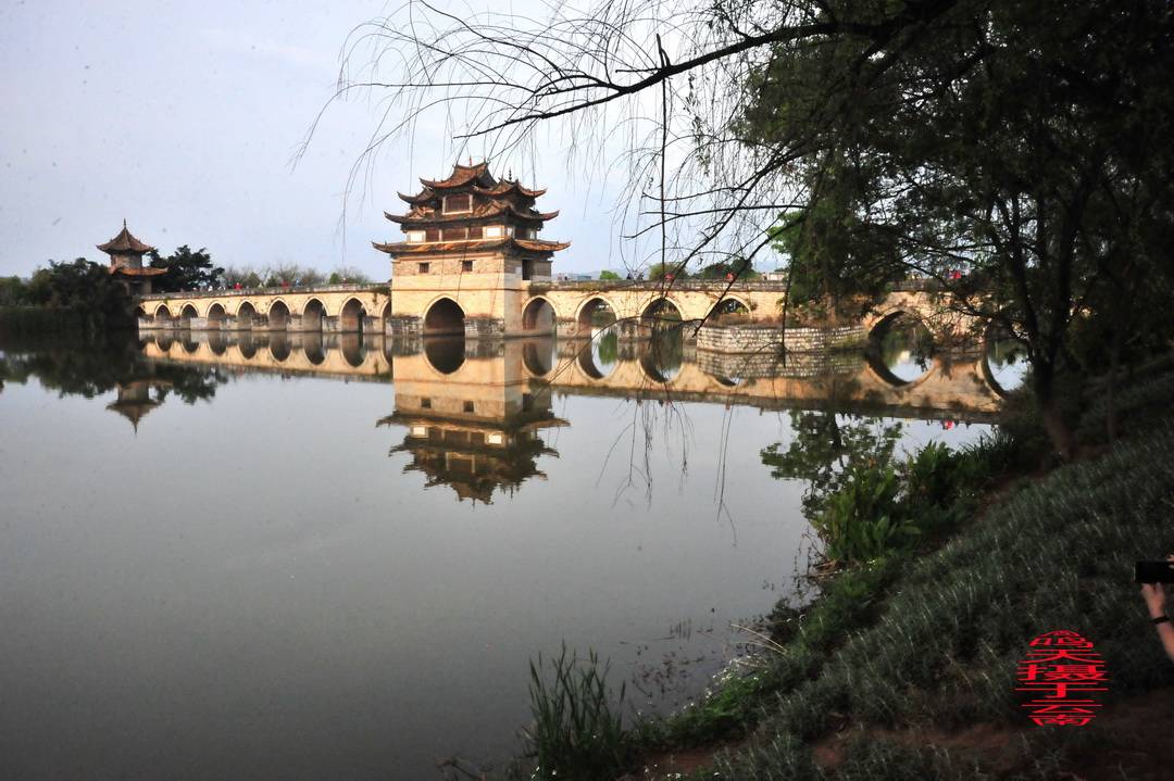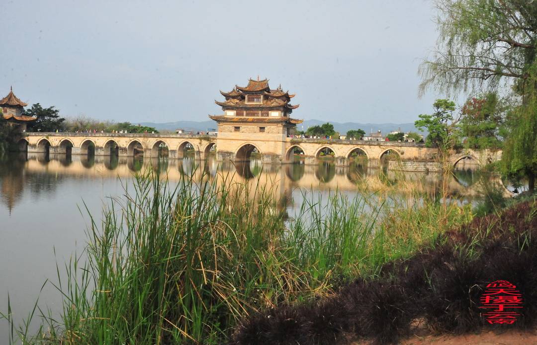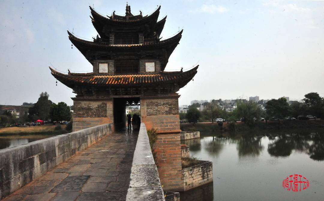 桥中建有三座飞檐式阁楼,楼中有楼,桥楼相映,蔚为大观,不失为我国造桥史上极为珍贵的杰作。两端阁楼略小,居中一座大而壮观,素有“滇南大观楼”之称。