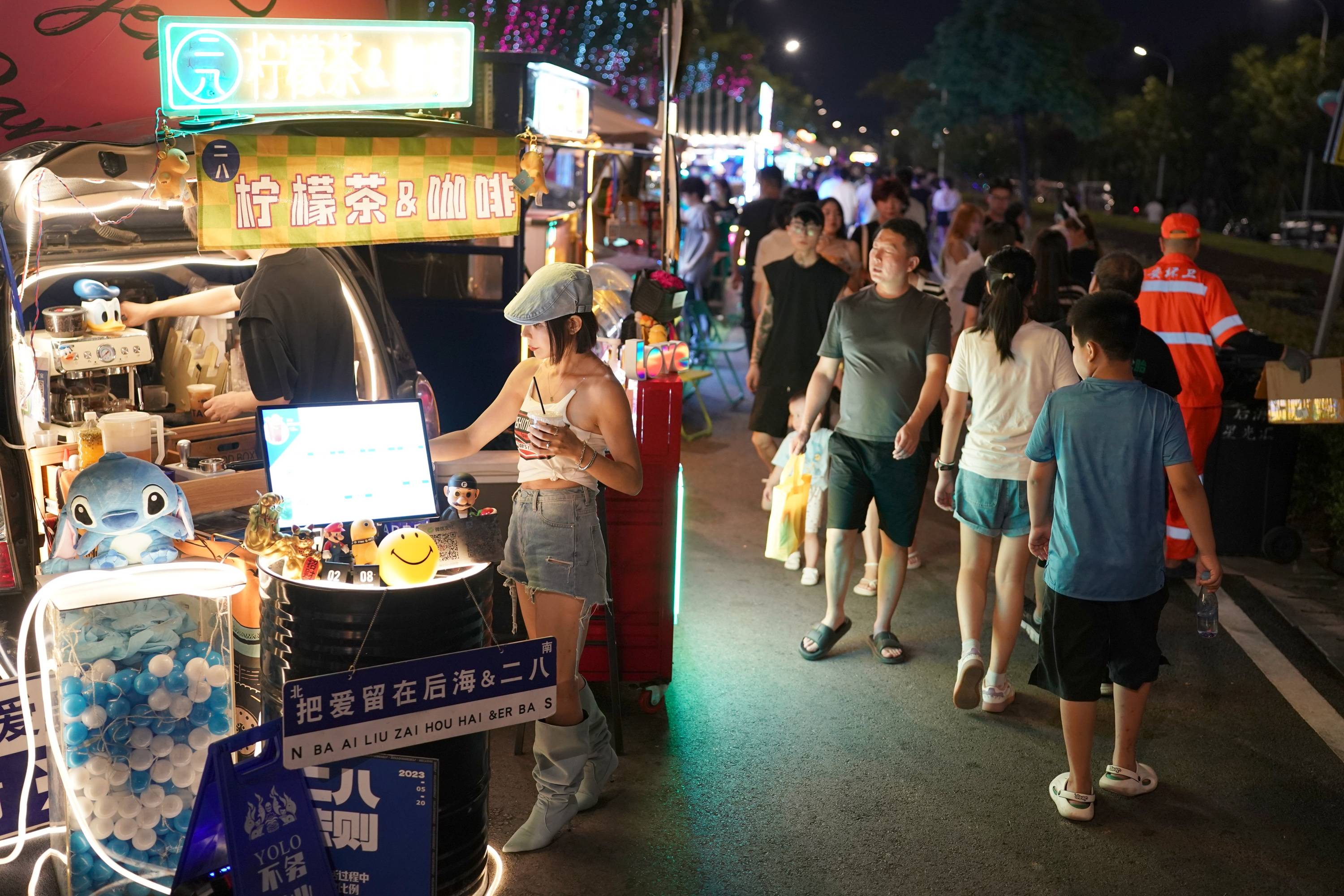 8月10日,游人在西安市浐灞生态区的后备箱集市上消费。 新华社记者 邵瑞 摄