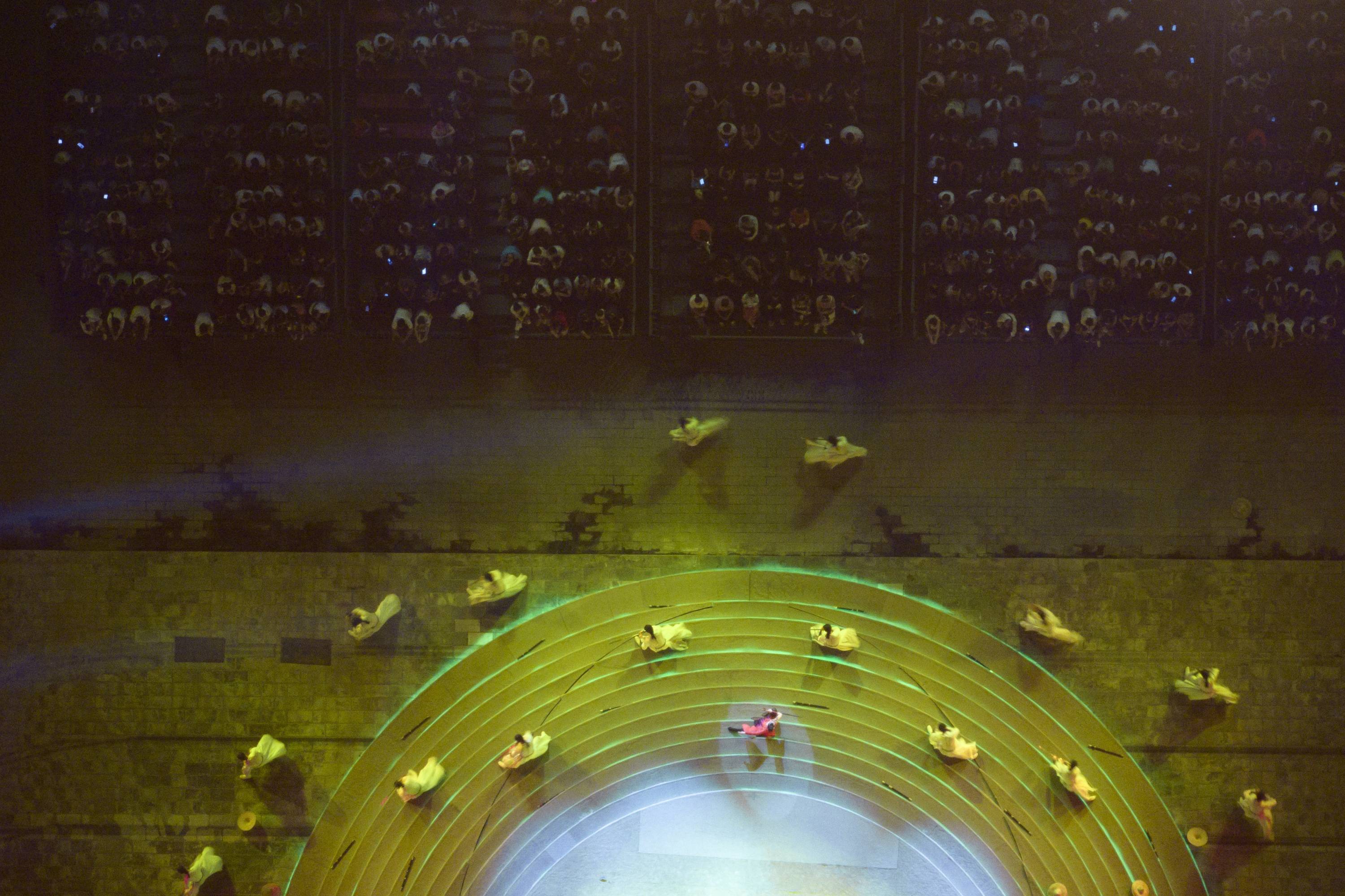 游客在西安城墙南门瓮城内观看文艺表演(8月10日摄,无人机照片)。 新华社记者 邵瑞 摄