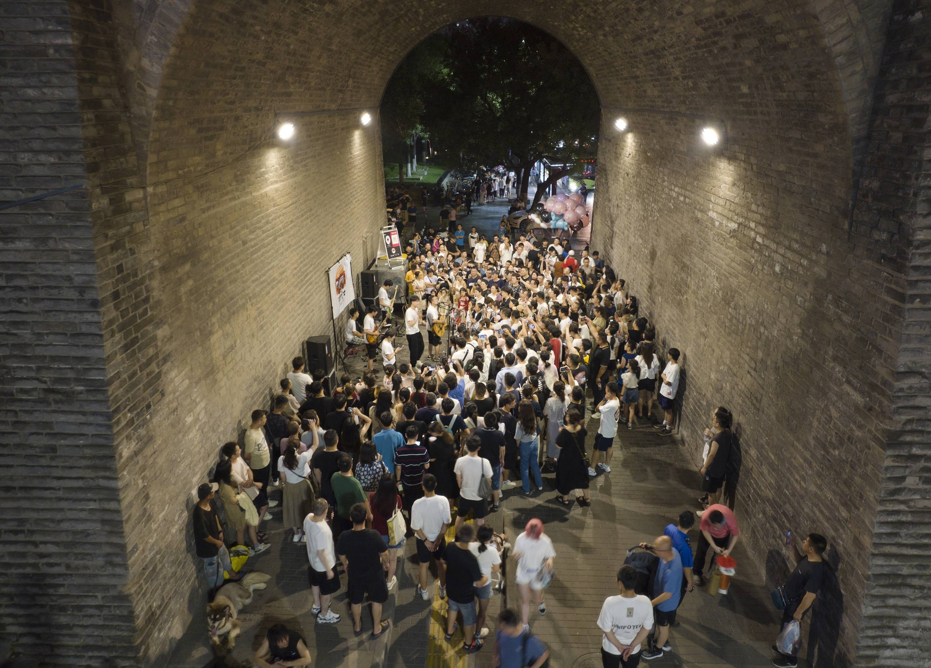 在西安城墙南门下,市民、游客在观赏乐队表演(8月10日摄,无人机照片)。 新华社记者 邵瑞 摄