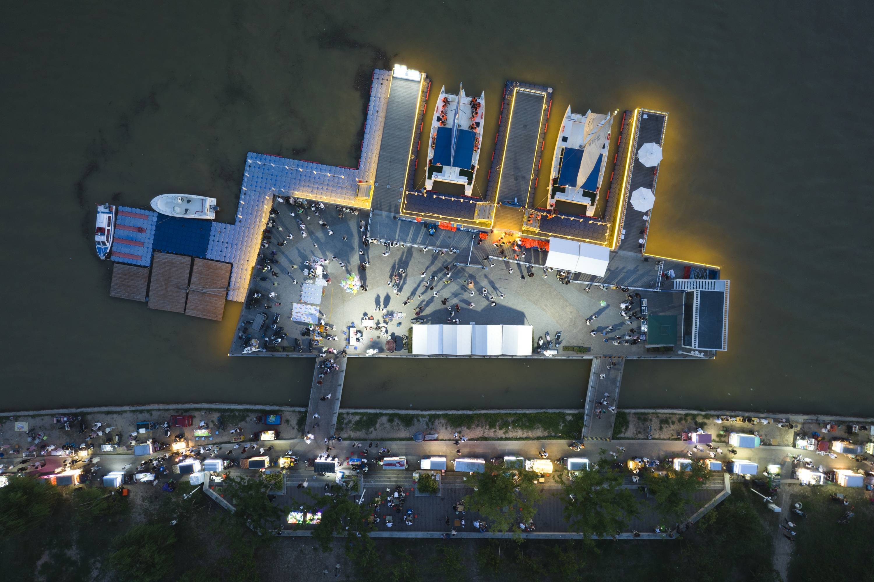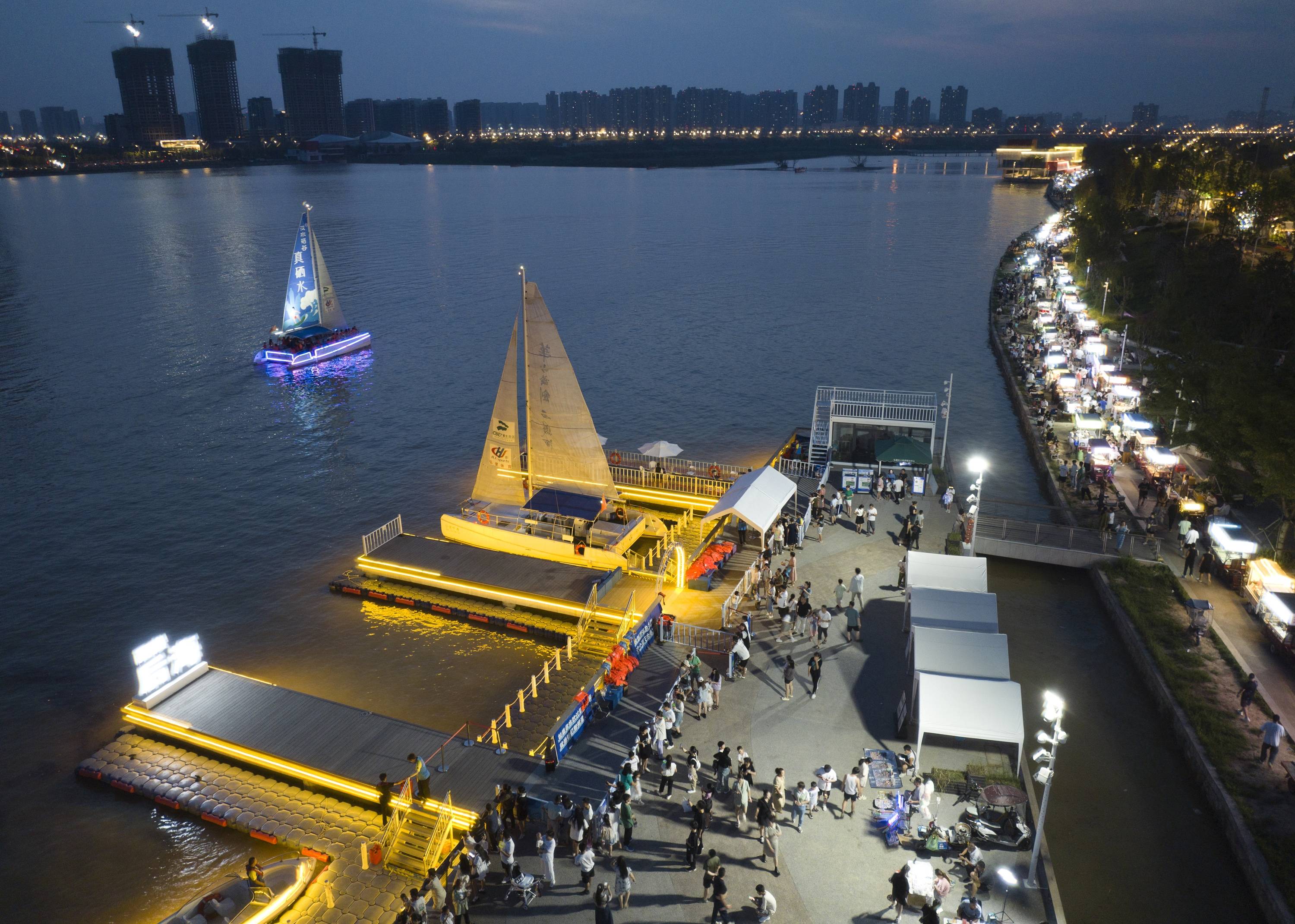 游人在西安市浐灞生态区一处游船码头和后备箱集市上游览(8月10日摄,无人机照片)。 新华社记者 邵瑞 摄